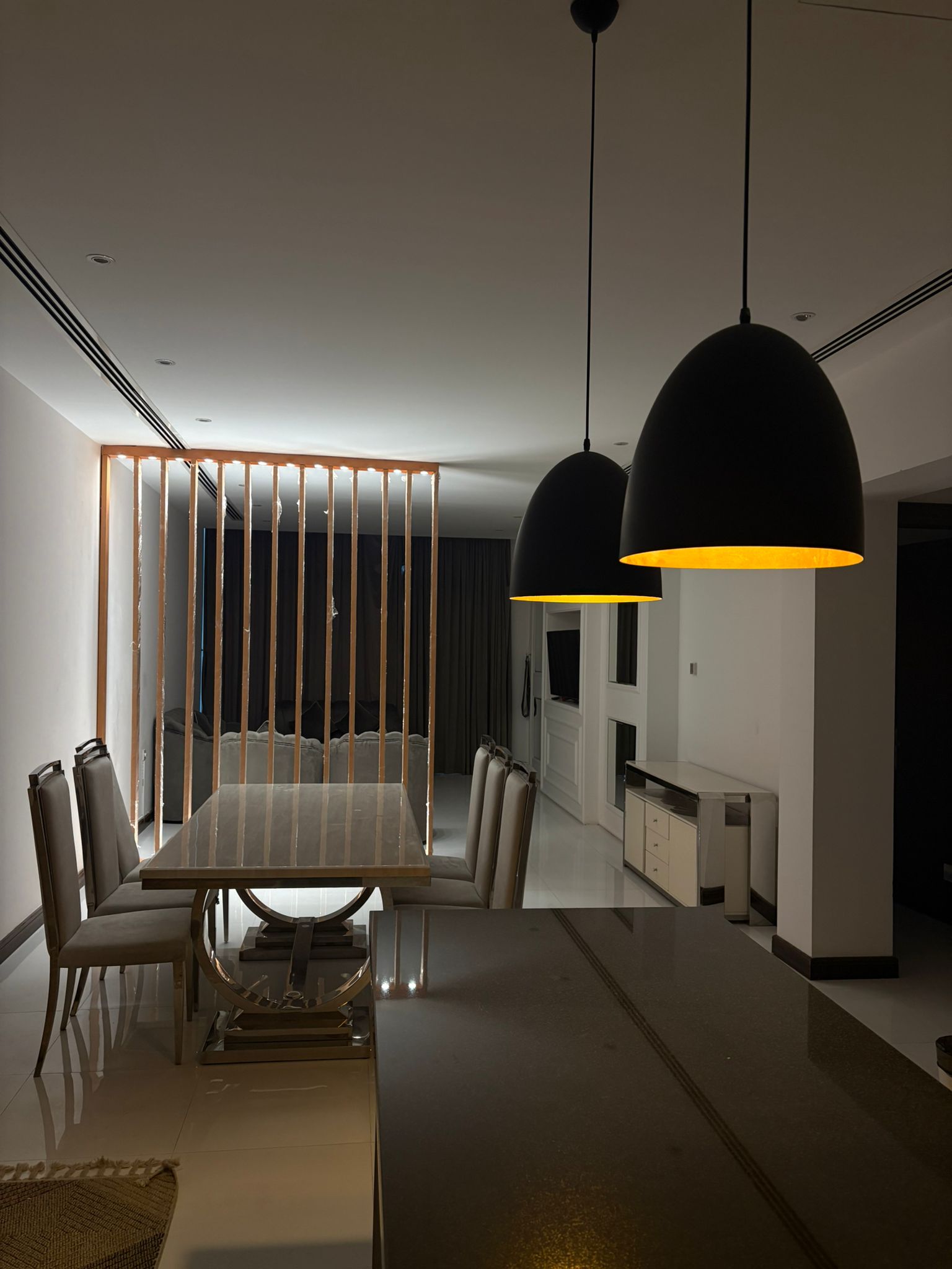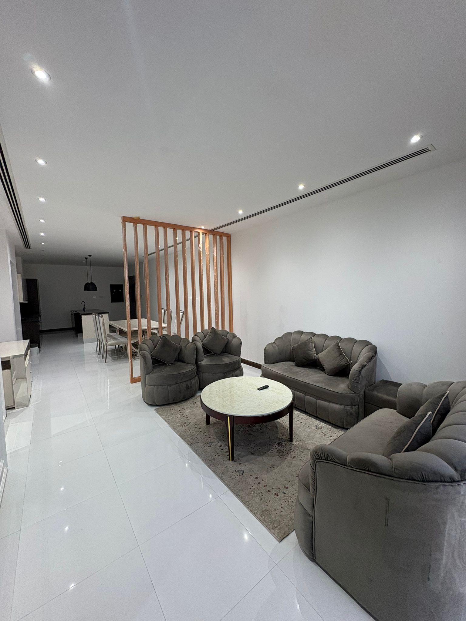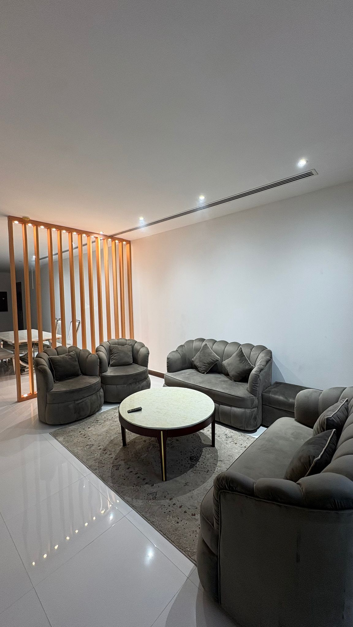 صالة معيشة واسعة مع طاولة طعام، مثالية للراحة وقضاء الوقت مع العائلة.